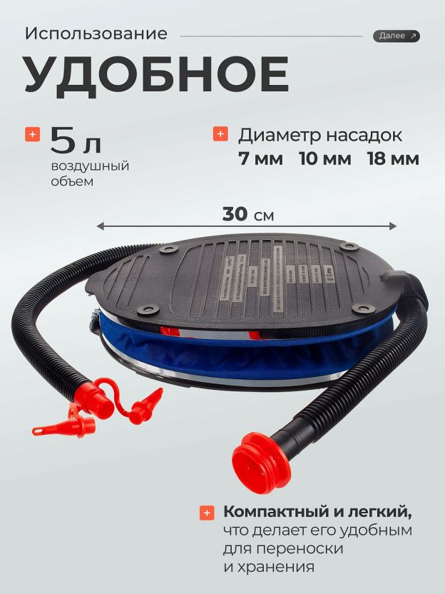 - Оснащен тремя насадками разного размера, что позволяет использовать его для накачивания различных изделий - от надувных матрасов и кроватей до надувных лодок и плавательных кругов.