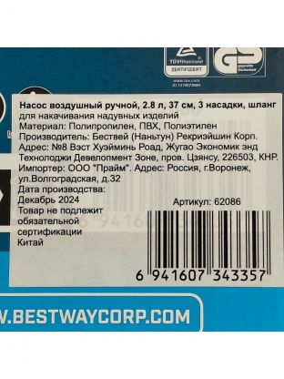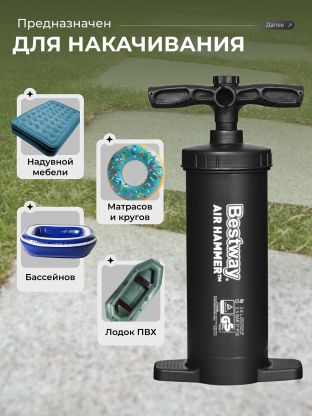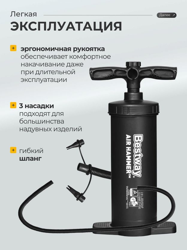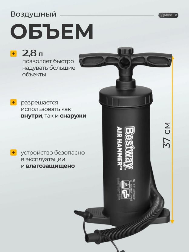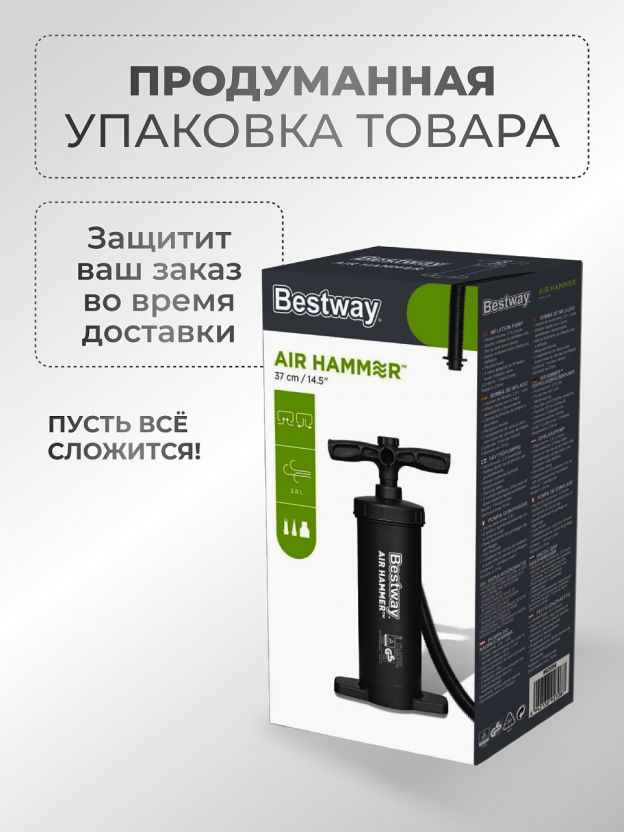 Насос воздушный ручной, 2.8 л, 37 см, 3 насадки, шланг, Bestway, 62086