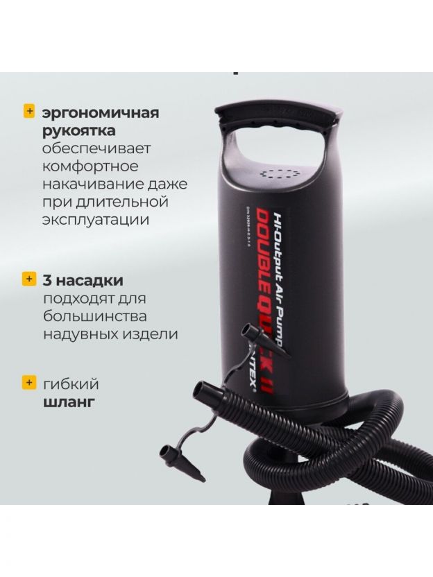 - Обладает системой двойного действия: накачивает надувные изделия как при прямом, так и обратном ходе поршня.