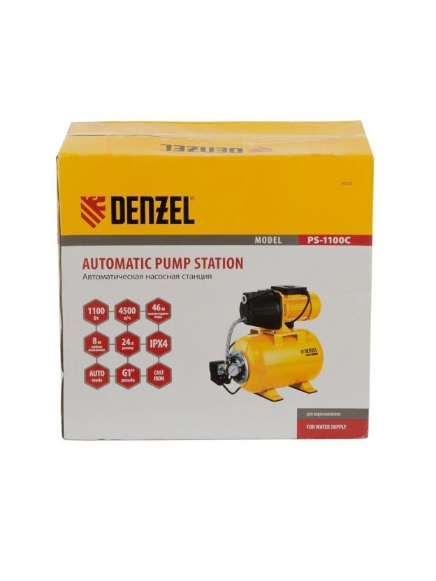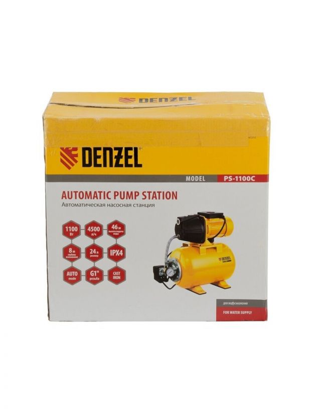 Насосная станция Denzel, 1100 Вт, глубина погружения 8 м, 46 м, 4.5 м3/ч, ресивер 24 л, чугун