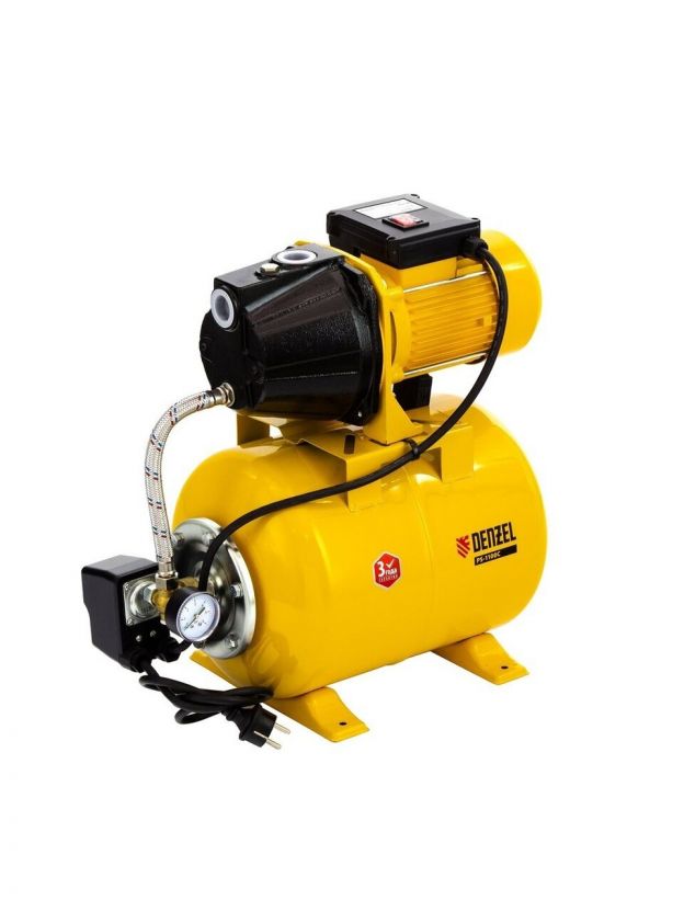 Насосная станция Denzel 1100 Вт с чугунным корпусом — надёжное решение для автономного водоснабжения дома и дачи: 46 м напора, ресивер 24 л, 3 года гарантии.