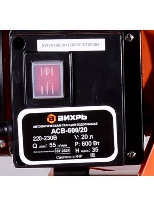 Насосная станция Вихрь, 600 Вт, глубина погружения 9 м, максимальный напор 35 м, 3.3 м3/ч, АСВ-600/20