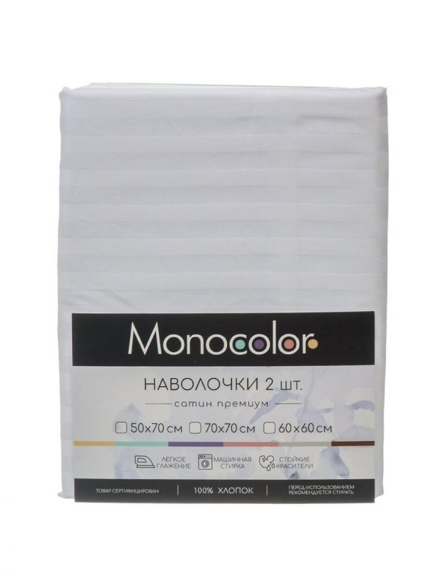 Наволочка 2 шт, Monocolor, страйп-сатин, 100% хлопок, 70 х 70 см, белая, 140 г/м2, 3182-1