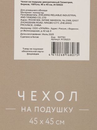Размер наволочки — 45x45 см, подходит для большинства стандартных декоративных и диванных подушек.