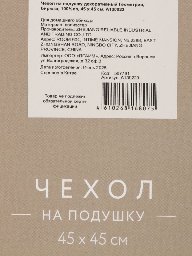 Наволочка «Геометрия» в бирюзовом оттенке — это быстрый способ добавить интерьеру свежести и индивидуальности. Благодаря универсальному размеру 45x45 см она подходит для большинства стандартных подушек. Ткань из 100% полиэстера устойчива к выцветанию, не требует сложного ухода и сохраняет форму даже при частой стирке. Молния скрыта, что делает использование максимально удобным и безопасным для мебели.