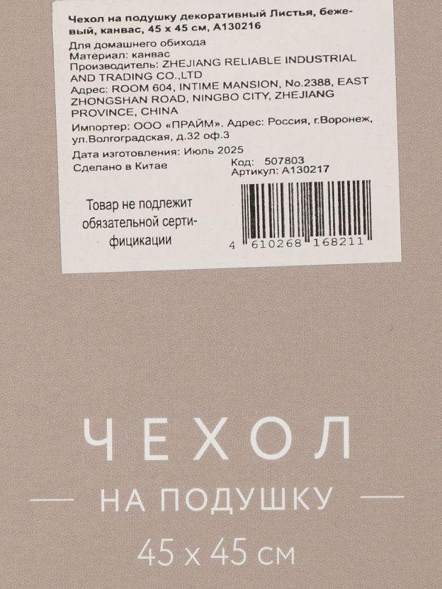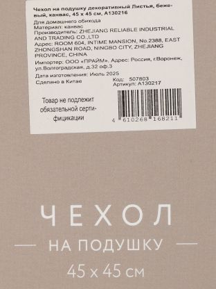 Наволочка декоративная «Листья» 45x45 см из бежевого канваса — стильное решение для обновления интерьера, выгодно подчеркнёт уют вашего дома или дачи.