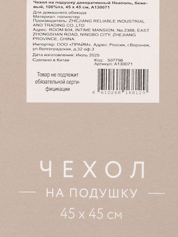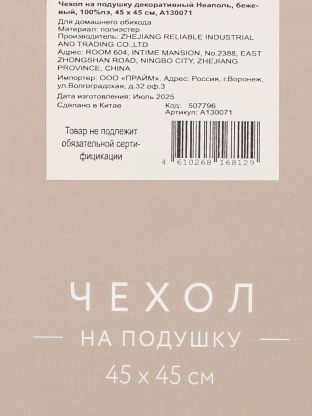Наволочка декоративная Неаполь 45x45 см, бежевый — стильное обновление интерьера за 1 минуту: мягкий 100% полиэстер, практичность, универсальный дизайн.