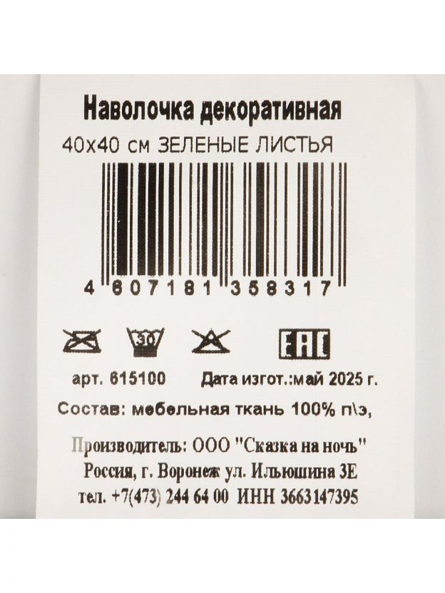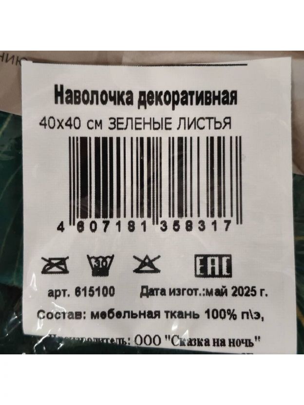 Наволочка декоративная Зеленые листья, 100% полиэстер, 40 х 40 см
