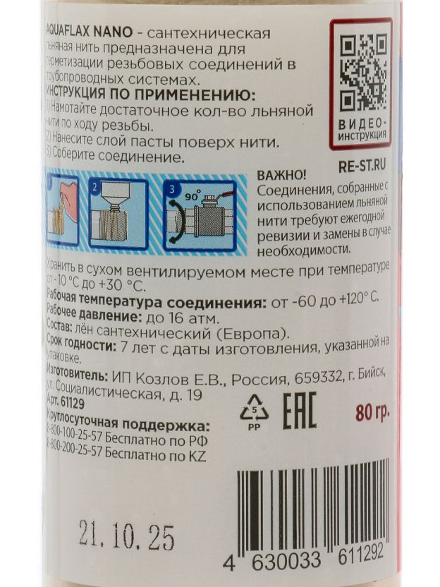 Закажите сантехническую нить Aquaflax nano с быстрой доставкой: получите надежную герметизацию, выгодную цену и гарантию от проверенного российского продавца.