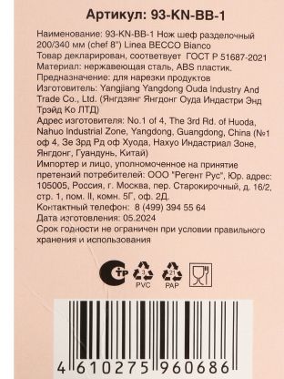 Нож Regent Inox, Becco Bianco, шеф-нож, нержавеющая сталь, 20 см, рукоятка пластик, 93-KN-BB-1