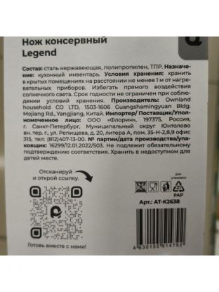 Нож консервный нержавеющая сталь, рукоятка пластик, навеска, Atmosphere, Legend, AT-K2638