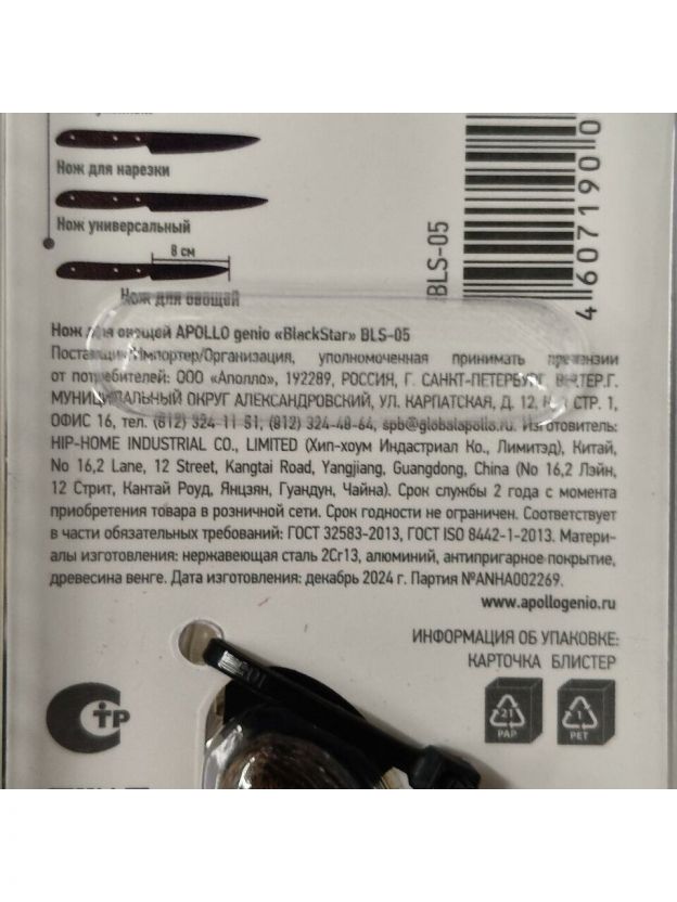Нож кухонный Apollo, BlackStar, для овощей, нержавеющая сталь, 8 см, рукоятка дерево, BLS-05