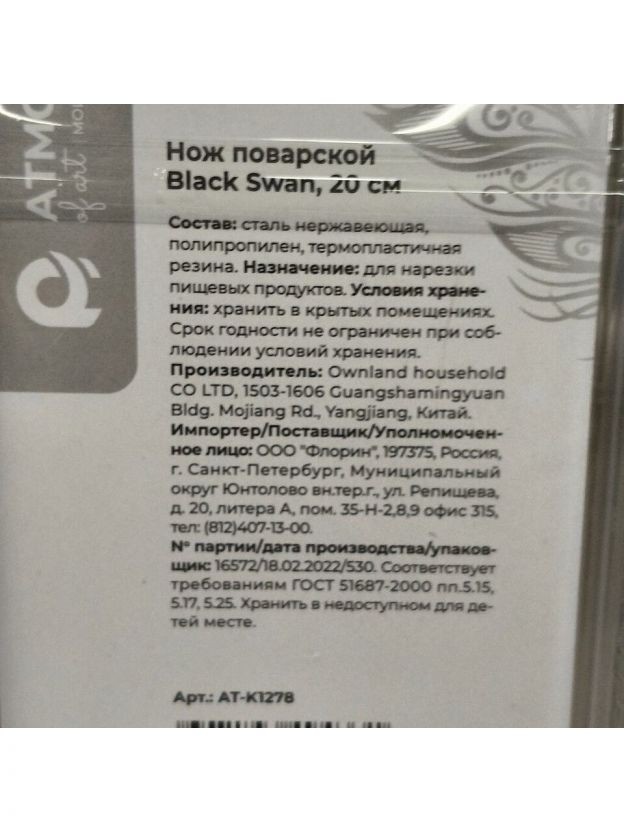 Нож кухонный Atmosphere, Black swan, поварской, нержавеющая сталь, 20 см, рукоятка пластик, AT-K1278