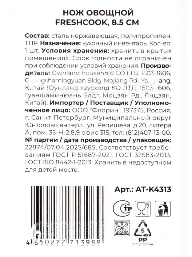 Нож Atmosphere FreshCook для овощей — это оптимальный выбор для тех, кто ищет недорогой, но надёжный инструмент для быстрой и аккуратной нарезки. Благодаря прямой кромке и односторонней заточке, нож обеспечивает ровные срезы, не травмируя структуру овощей. Вопросы типа «какой нож лучше для помидоров или картофеля» часто возникают у покупателей — здесь важна длина лезвия и его материал. Модель AT-K4313 с лезвием 8.5 см из нержавеющей стали подходит для большинства овощей, не требует особого ухода, а рукоятка из нейлона делает работу безопасной и комфортной.