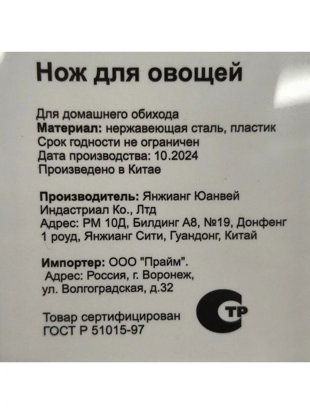 Нож выполнен из высококачественной нержавеющей стали, благодаря чему лезвие долго сохраняет заточку. Рукоятка выполнена в эргономичной форме из пластика, что не позволяет ножу выскальзывать из рук.