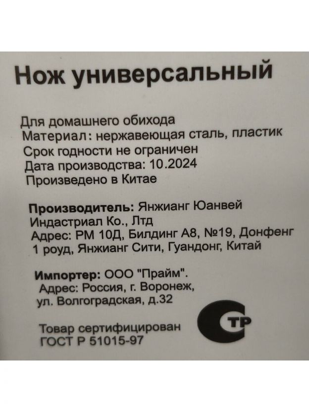 Нож выполнен из высококачественной нержавеющей стали, благодаря чему лезвие долго сохраняет заточку. Рукоятка выполнена в эргономичной форме из пластика, что не позволяет ножу выскальзывать из рук.