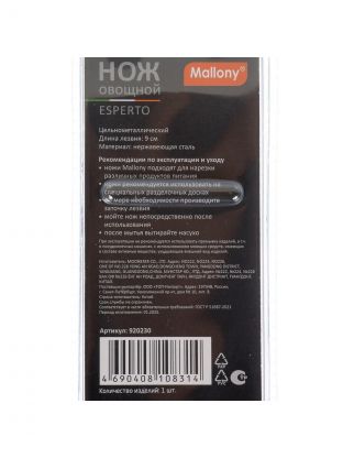 Нож для овощей Mallony Esperto с лезвием из нержавеющей стали — оптимальный выбор для чистки, нарезки и шинковки овощей. Благодаря двусторонней заточке и длине лезвия 9 см, он обеспечивает точный и безопасный срез даже для мелких продуктов. Часто спрашивают, какой нож выбрать для овощей — Esperto сочетает компактность, эргономику и долговечность, что выгодно отличает его от аналогов с пластиковыми или деревянными ручками.