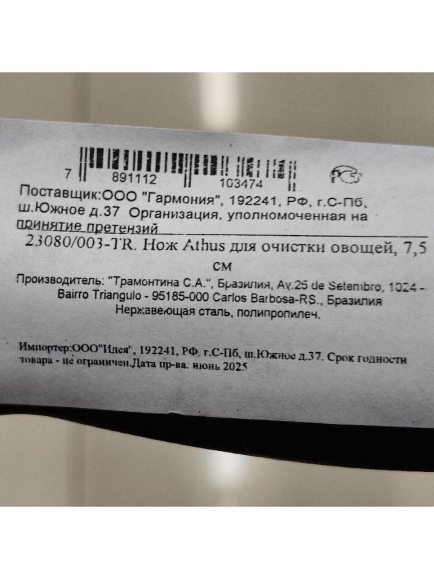 Нож кухонный Tramontina, Athus, для овощей, рукоятка черная, нержавеющая сталь, 7.5 см, рукоятка пластик, 23080/003-TR