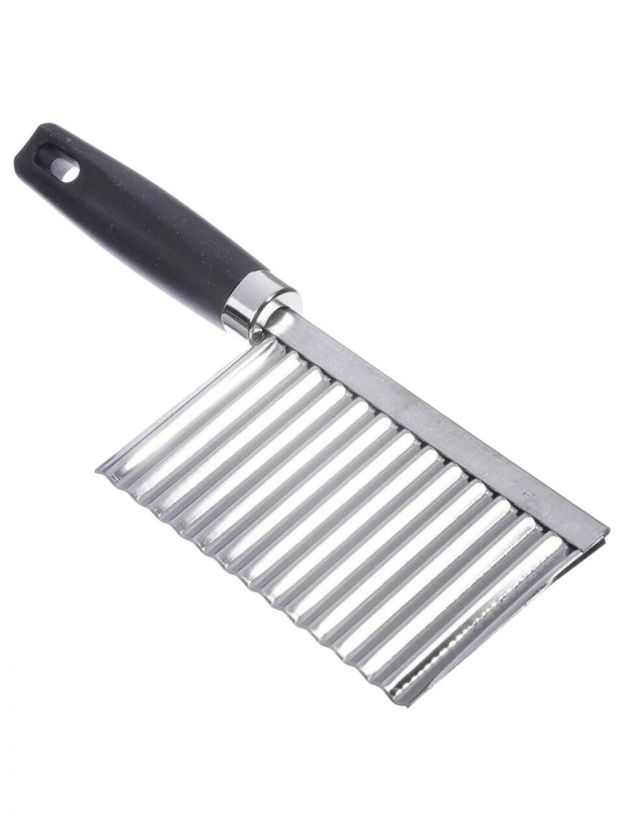 Нож имеет характерное лезвие с выпуклыми зубцами по всему прямому полотну. При нарезании продуктов он придает поверхности ломтиков красивую волнистую форму. Такими ножами удобно резать торты, сыры и ветчину.