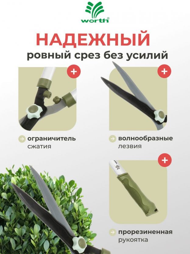 - Форма лезвия позволяет создавать декоративные формы и узоры при стрижке живой изгороди.