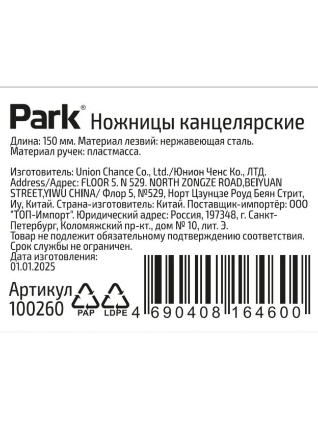 Если вы ищете, какие ножницы выбрать для бумаги, ткани или упаковки, обратите внимание на модель Park 100260. Лезвия из нержавеющей стали устойчивы к коррозии и сохраняют заточку дольше, чем обычные аналоги. Благодаря эргономичной пластиковой ручке ножницы удобно лежат в руке — даже при длительной работе кисть не устает.