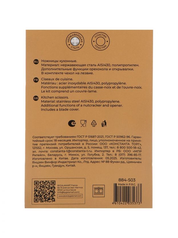 Да, модель оснащена встроенным орехоколом, открывалкой и навеской для хранения. Это делает ножницы многофункциональным инструментом для кухни, дома и подарка.