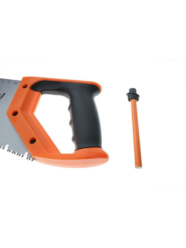 В рукоятке ножовки предусмотрен отсек для карандаша, что позволяет быстро переключаться между распилом материала и нанесением разметки. Это значительно экономит время и упрощает работу, исключая необходимость отвлекаться на поиск пишущих инструментов. Такое решение делает процесс работы более эффективным и удобным.