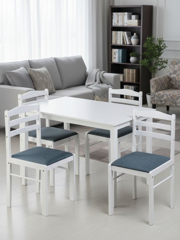 Обеденная группа 70х110 см с четырьмя стульями "Аквамарин" — оптимальное решение для тех, кто ищет, какой стол выбрать для небольшой кухни или как обустроить уютную столовую зону. Деревянная прямоугольная столешница устойчива к царапинам и влаге, а мягкие текстильные сиденья обеспечивают комфорт даже при длительных посиделках. Благодаря универсальному белому цвету и лаконичному дизайну комплект легко впишется в современный или классический интерьер.