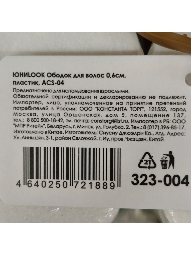 Ободок для волос ЮниLook, 0.6 см, пластик, в ассортименте, ACS-04/323-004