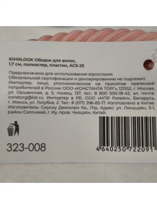 Ободок для волос ЮниLook, 1.7 см, полиуретан, полиэстер, в ассортименте, ACS-25/323-008