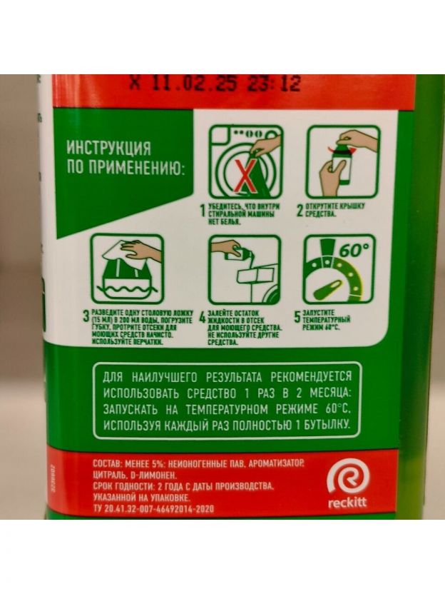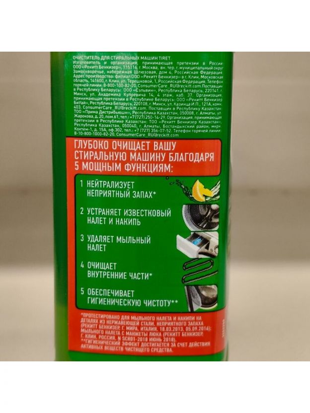 Очиститель для стиральных машин Tiret комплексно очищает вашу стиральную машину благодаря 5 мощным функциям: Устраняет известковый налет и накипь; Удаляет мыльный налет; Обеспечивает гигиеническую чистоту; Устраняет неприятный запах; Защищает стиральную машину; Характеристики: Объем: 250 мл; Марка: TIRET; Температурный режим: 60°С; Состав: 15% или более, но менее 30%: лимонная кислота, менее 5%: неионогенные ПАВы, ароматизатор;