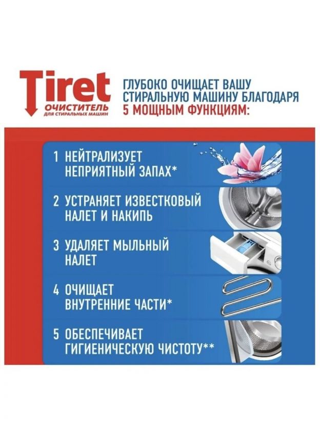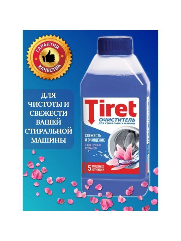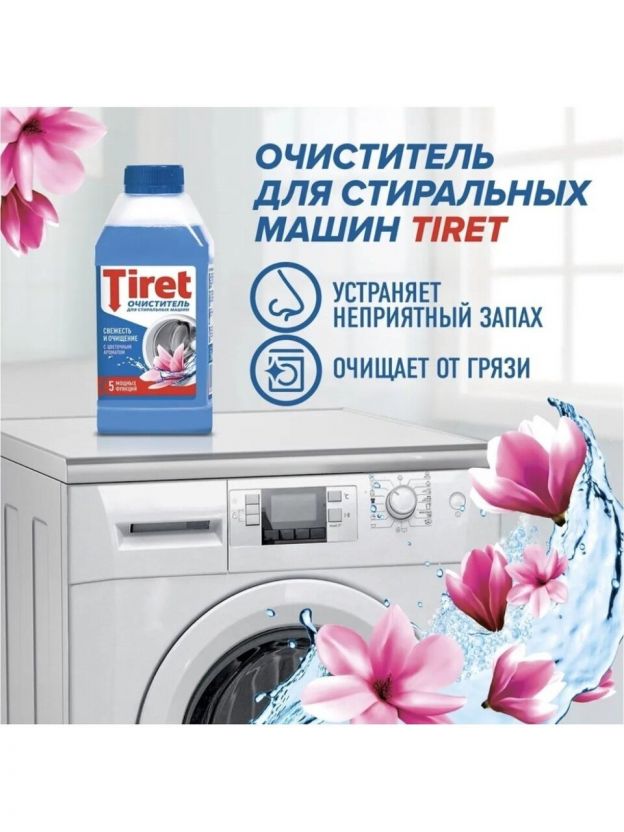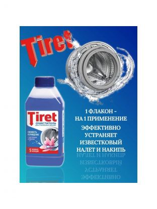 Средство для стиральных машин Tiret комплексно очищает стиральную машину. Для наилучшего результата следуйте инструкции: убедитесь, что внутри стиральной машины нет белья. Открутите крышку. Добавьте небольшое количество средства на губку и протрите отсеки для моющего средства и ополаскивателя. Залейте остаток жидкости в отсек для моющего средства. Запустите температурный режим 60 °С. Рекомендуется запускать 2 пустых цикла в год при температурном режиме 60 °С, используя каждый раз 1 бутылку.