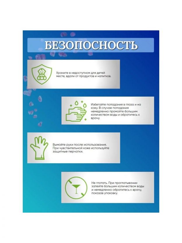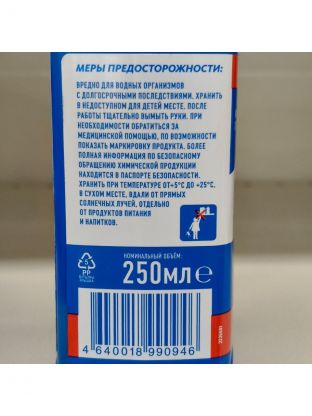 Меры предосторожности: храните в недоступном для детей месте, вдали от продуктов питания и напитков. Избегайте попадания в глаза и на кожу. В случае попадания в глаза незамедлительно промойте их большим количеством воды и обратитесь к врачу. Вымойте руки после использования. При чувствительной коже используйте защитные перчатки. Не глотать.