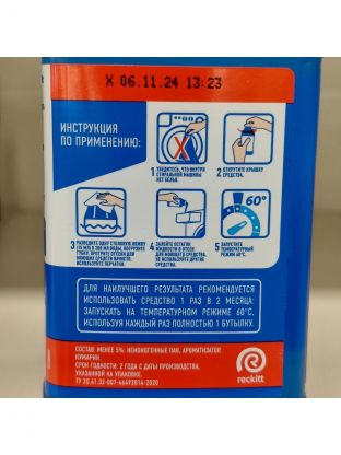Состав: 15% или более, но менее 30% лимонная кислота, менее 5% хлорсодержащий отбеливатель и неионогенные ПАВ, ароматизатор.