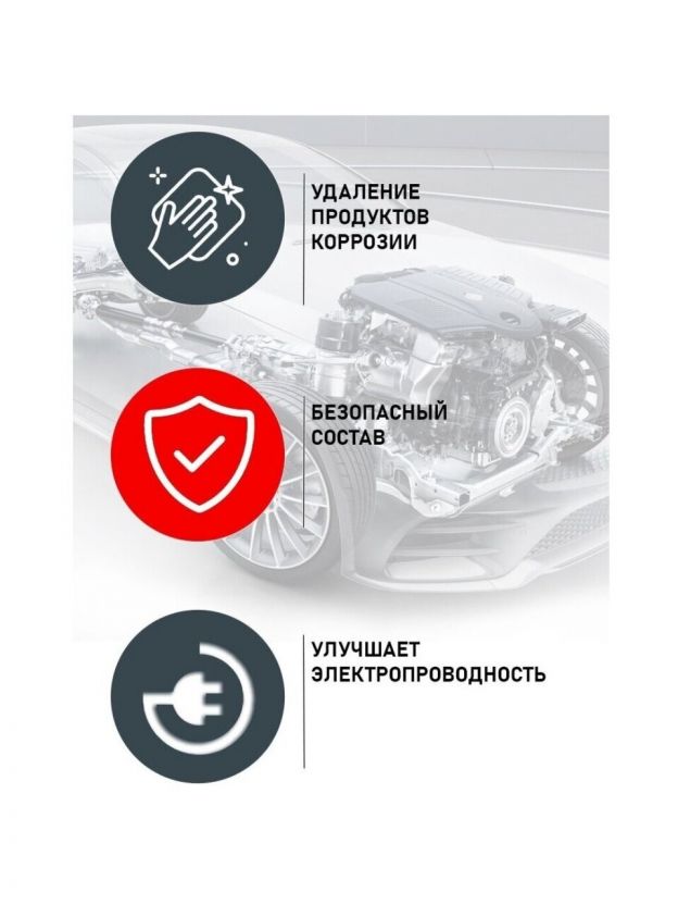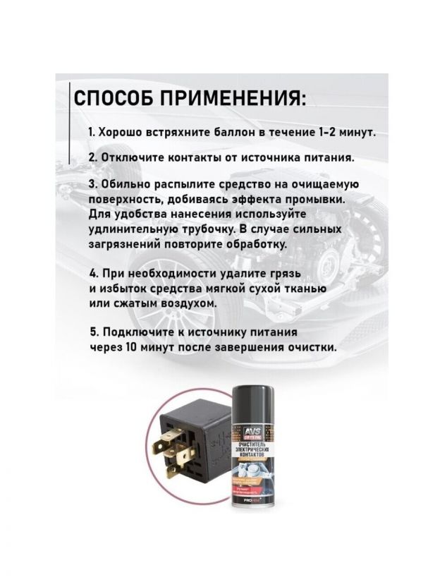 Предназначен для очистки контактов электрооборудования автомобиля, компьютеров, аудио- и видеотехники, а также любых других электрических приборов и устройств. Быстро и эффективно удаляет: масло, жир, продукты коррозии и влагу с контактов. Безопасен для лакокрасочных покрытий, резиновых и пластиковых деталей. Легко очищает поверхность, растворяя любые загрязнения. Незаменим при обслуживании таких элементов и деталей автомобиля, как: электроплаты, штекерные соединения, реле, зажимы, клеммы, цоколи ламп, распределители зажигания, стартеры, генераторы, антенны и т.д. Способ применения: Хорошо встряхните баллон в течение 1-2 минут. Отключите контакты от источника питания. Обильно распылите средство на очищаемую поверхность, добиваясь эффекта промывки. Для удобства нанесения используйте удлинительную трубочку. В случае сильных загрязнений повторите обработку. При необходимости удалите грязь и избыток средства мягкой сухой тканью или сжатым воздухом. Подключите к источнику питания через 10 минут после завершения очистки. Состав: спирт изопропиловый > 30%, алифатические углеводороды > 30%, нафтеновые углеводороды хлорированные углеводороды