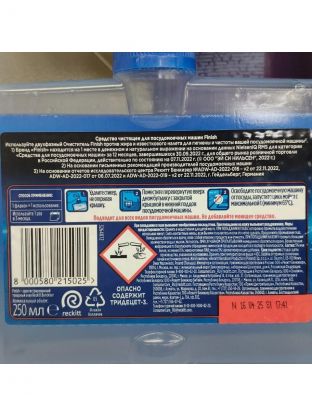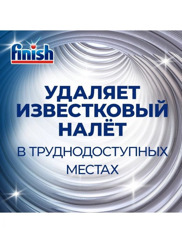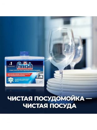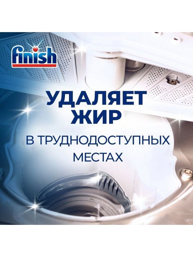 Очиститель для посудомоечных машин Finish удаляет жир и известковый налёт, который скапливается на поверхности внутренних деталей, что оказывает влияние на качество мытья столовых приборов.
