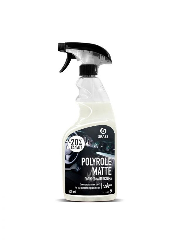 Профессиональный матовый полироль Grass «Polyrole Matte» для обработки приборных панелей, неокрашенных бамперов, покрышек, для очистки и полировки изделий из кожи, дерева винила, пластика и резины, не оставляет жирных пятен, препятствует оседанию пыли придает матовый блеск, обладает приятным ароматом.