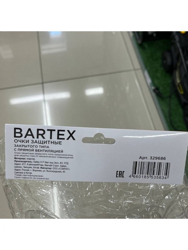 Очки защитные, Bartex, закрытого типа с прямой вентиляцией, 1341105