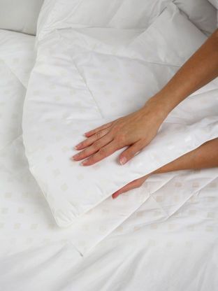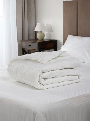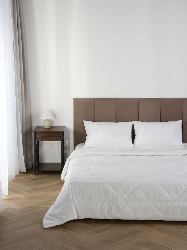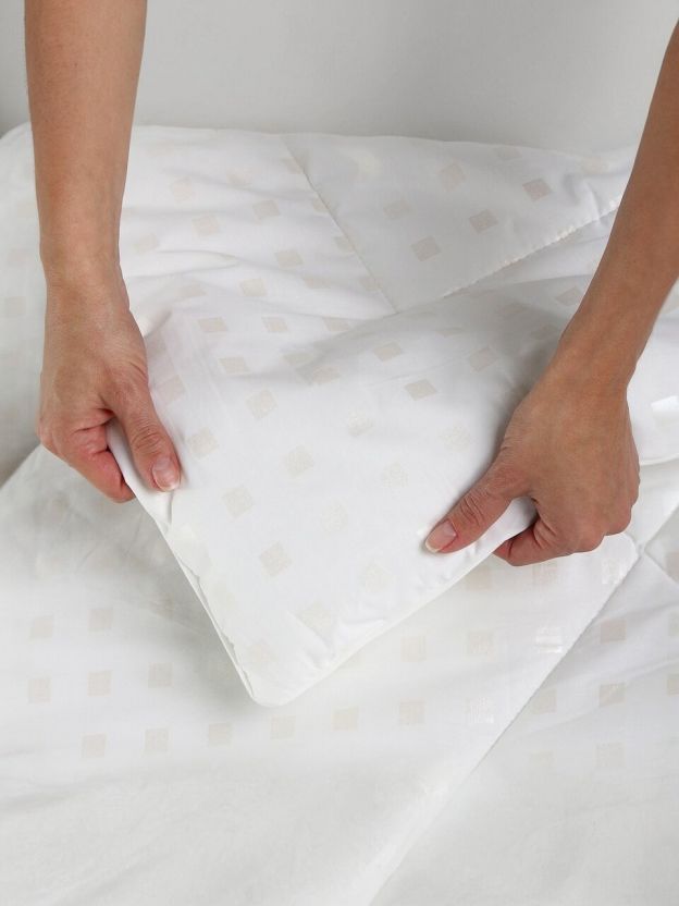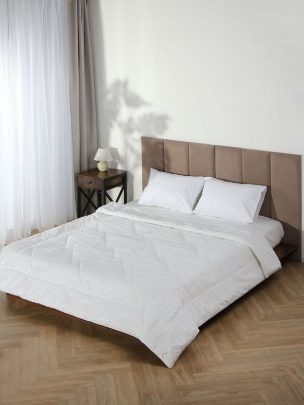 Размер: 140х205 см (1,5-спальное), наполнитель — эвкалипт, плотность 150 г/м2, чехол — хлопковый тик с кантом. Лёгкое, компактное, подходит для стандартных кроватей.
