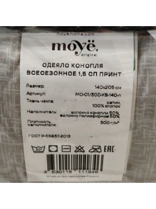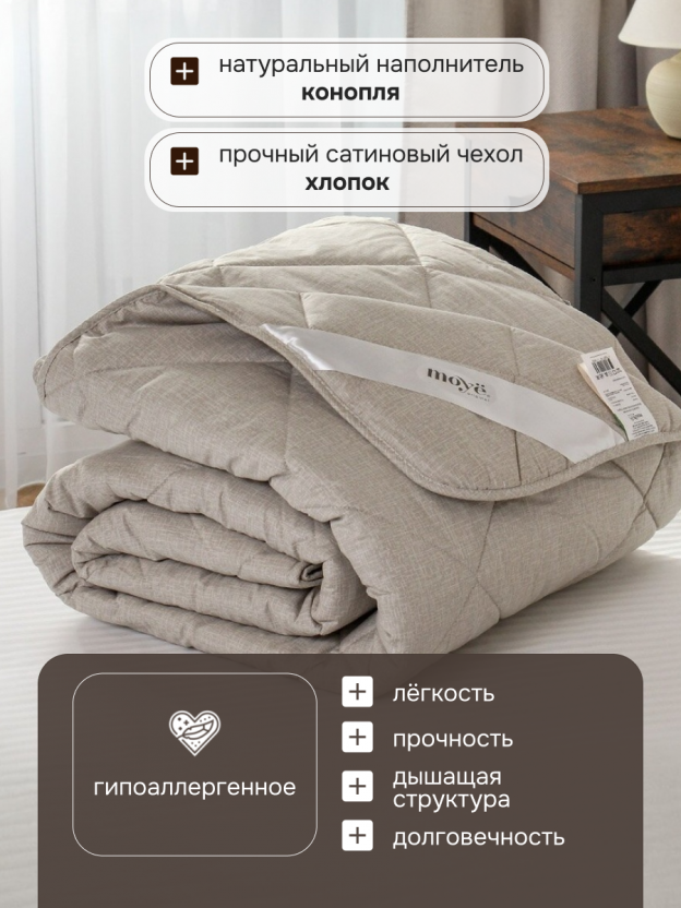 Одеяло 1.5-спальное Moyё 140х205 см: натуральный наполнитель конопля, всесезонное, сатиновый чехол, комфорт для дома и дачи по выгодной цене.