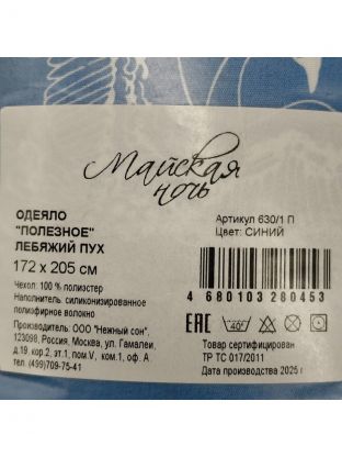 Одеяло 2-спальное, 172х205 см, Лебяжий пух, волокно полиэфирное, 100 г/м2, облегченное, чехол 100% полиэстер, кант, Майская ночь, синее