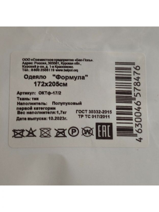 Одеяло 2-спальное, 175х205 см, Формула, полупух I кат, пух 60% перо 40%, 400 г/м2, зимнее, чехол тик, кант, Бел-Поль