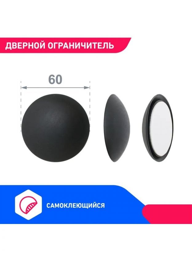 Ограничитель дверной выполнен из мягкого пластика, самоклеющийся. Имеет форму полусферы. Приклеивается на стену в место удара дверной ручки (двери) или на дверь в место удара об стену. Сохраняет на долгое время внешний вид ручки, двери и стены, поглощает шум от удара.