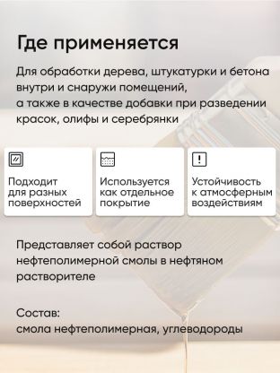Применяется для покрытий по дереву, штукатурке, бетону и т.д., эксплуатируемых внутри и снаружи помещений и как добавка для изготовления и разведения красок и изготовления комбинированных олиф и красок, в том числе серебрянки. Благодаря современным технологиям производства и высокому стандарту качества, олифа обеспечивает долговечную защиту и привлекательный внешний вид материалов. Продукт поставляется в удобной канистре объемом 10 литров, что делает его оптимальным выбором для масштабных работ в доме, на даче или при ремонте. Коричневый цвет олифы подчеркивает естественную структуру дерева и создает эстетичный финиш. Применение термополимерной олифы НХП позволяет эффективно увеличить срок службы конструкций и минимизировать затраты на последующий уход.