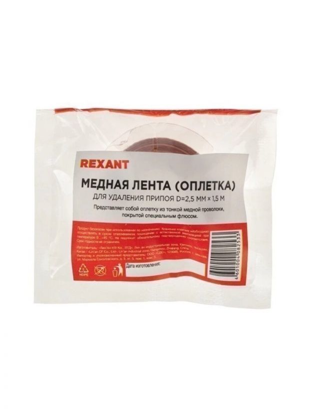 Оплетка для удаления припоя, медная, 2,5мм x 1,5м REXANT 09-3003 — идеальный инструмент для аккуратного и эффективного удаления припоя при ремонте электроники. Высокое качество меди обеспечивает отличную теплопроводность и надежный результат при работе. Компактная бухта удобно хранится и всегда под рукой.