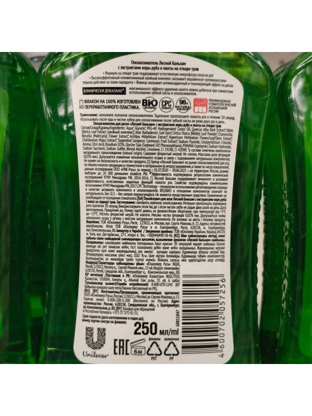 Бренд Лесной бальзам - это проверенные продукты, способствующие снижению воспаления, кровоточивости десен и обеспечивающие качественную профилактику основных проблем полости рта в домашних условиях. Формула ополаскивателя для полости рта при кровоточивости десен на 95% состоит из компонентов натурального происхождения, имеет насыщенный вкус хвойных масел в сочетании с мятной свежестью. Содержит хвойный комплекс (на основе экстрактов пихты, живицы, можжевельника) с отваром 5 целебных трав, экстрактом коры дуба и соком алоэ. Такой сбалансированный состав способствует укреплению кровеносных сосудов десен, улучшает кровообращение и питание мягких тканей полости рта, препятствует повторному возникновению кровоточивости при чистке зубов. Характеристики: Вид аромата: хвойный; Текстура продукта: однородная жидкость без посторонних примесей; Форма продукта средства (концентрата): жидкость; Цвет продукта: зеленый; Профилактический ополаскиватель для полости рта Лесной бальзам на отваре трав обладает иммуноактивным действием, помогает решить проблему кровоточивости десен и в 2 раза улучшает работу собственного иммунитета полости рта, снижая риск развития проблем с деснами. Клинически-доказанный эффект: С первого применения улучшает состояние десен; До 94% снижает кровоточивость десен при регулярном использовании; В 5 раз снижает скорость образования налета на зубах, уменьшая бактериальную нагрузку на мягкие ткани полости рта, не нарушает баланс микрофлоры;