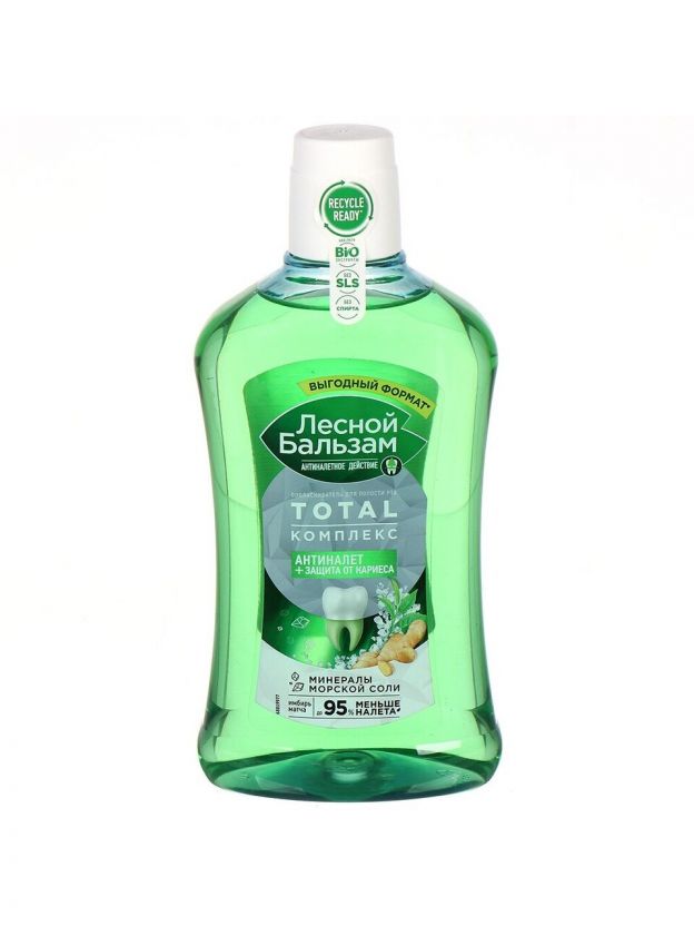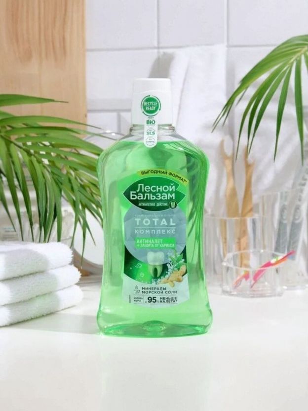 Лесной бальзам Total комплекс с морской солью, экстрактом имбиря и чаем матча, в составе которого 98% ингредиентов натурального происхождения. Ополаскиватель борется с первопричиной развития серьезных проблем полости рта – зубным налетом, который вызывает кариес, влияет на изменение цвета зубов, приводит к образованию зубного камня и кровоточивости десен.