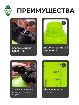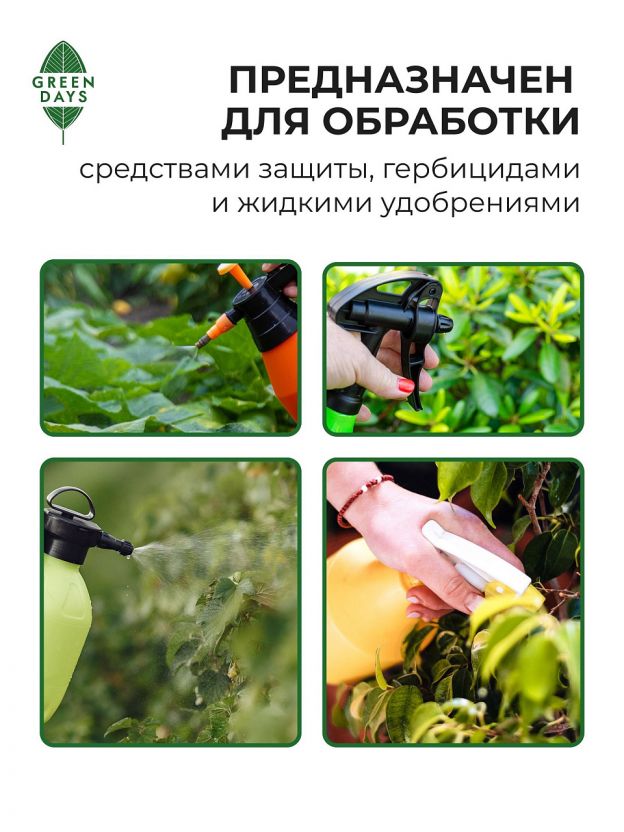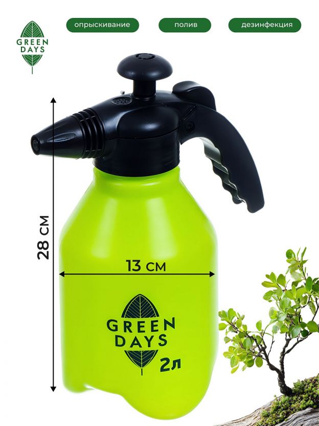 Распылитель ручной "Green Days" применяется для полива и опрыскивания садовых и комнатных растений. Оснащен распылительной головкой для работы в труднодоступных местах. Удобная рукоятка с углублениями для пальцев не дает емкости выпасть из рук. А также уменьшает нагрузку на кисть. Легкий корпус, выполненный из высококачественного пластика, прослужит длительное время.