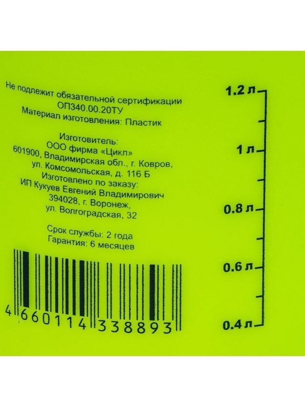 - Верхняя метка мерной шкалы не отражает максимально возможное наполнение. Максимальный объем жидкости: 1.9 л.