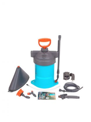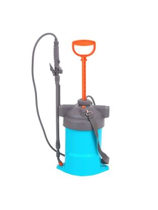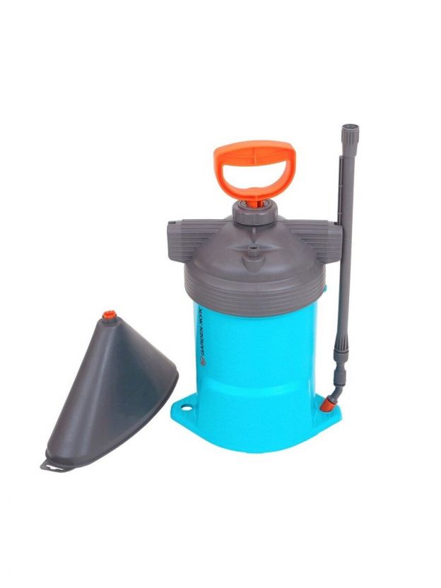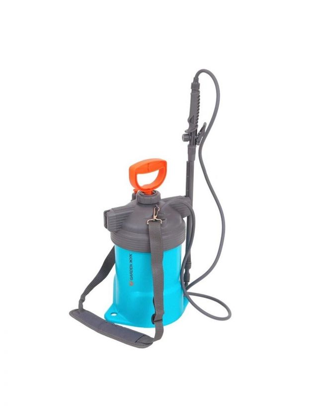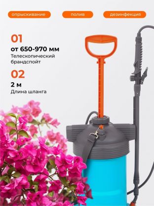 - Фиксатор на брандспойте делает работу удобнее, позволяя не держать кнопку постоянно нажатой. Устойчивый бак предотвращает опрокидывание опрыскивателя.